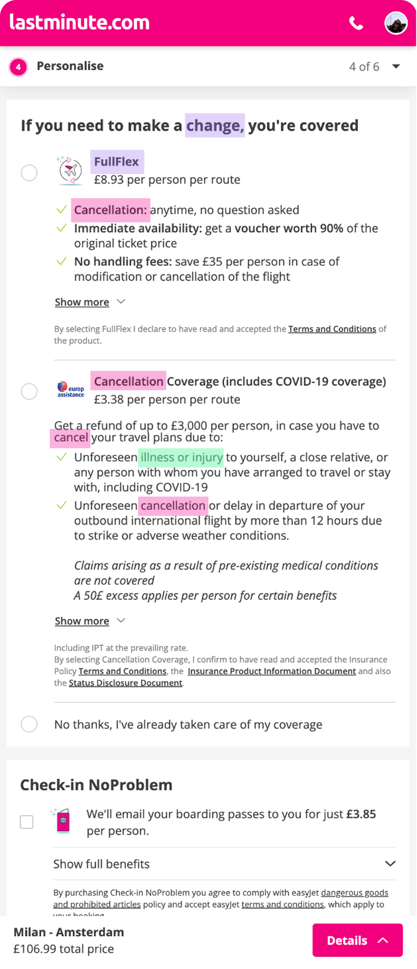 From research we knew that users were at times confused with our services (ancillaries) and believed they were being sold the same thing multiple times.